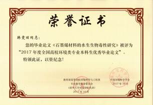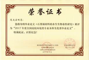 在教育部高等学校环境科学与工程类专业教学指导委员会与中国环境科学学会联合组织的“2017年度全国高校环境类专业本科生优秀毕业设计(论文)评选活动”中,我校空间与环境学院环境工程专业2013级本科生韩雯丽同学的毕业论文《石墨烯材料的水生生物毒性研究》,被评为优秀毕业论文。指导教师为范文宏教授。