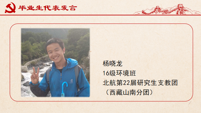 陈诗杰、王雪和杨晓龙作为16级毕业生代表发言。陈诗杰同学保研至空间与环境学院环境工程专业,王雪同学选择到中科院国家空间科学中心继续深造,杨晓龙同学将去往西藏山南支教一年。他们讲述了自身选择的缘由,并表示作为新时代的青年大学生,应该主动到祖国需要的地方去,承担起自己的责任。