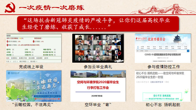在本次会议中,徐婧雨带领同学们回顾了北斗卫星全球组网完成,2020年高考在推迟一个月后成功进行,北京新冠疫情得到控制,近日中央气象台继续发布暴雨黄色预警,全国多地会出现暴雨等强对流天气等时事新闻。通过了解国内外大事,增强了同学们的国家自信心和民族认同感,并提醒同学们在进行旅游、探亲等外出活动时要关注天气、注意安全。
