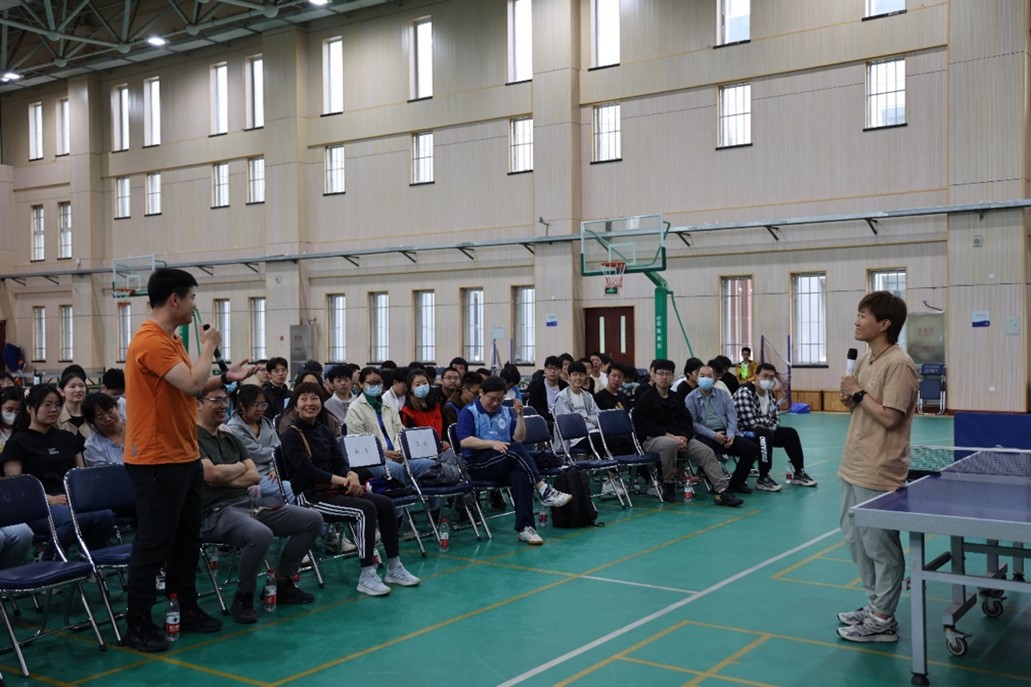 妙趣横生的技巧讲授——郭焱通过自身在国家队和国际比赛中的丰富经历与经验,为师生传授了乒乓球技巧的精髓。从乒乓球拍的选择到国家队的训练,从接发球到攻防技巧,郭焱深入浅出地回答了师生们的问题,并通过实战演示激励大家感悟“热爱、专注、享受”的体育精神,磨砺意志,强健体魄。