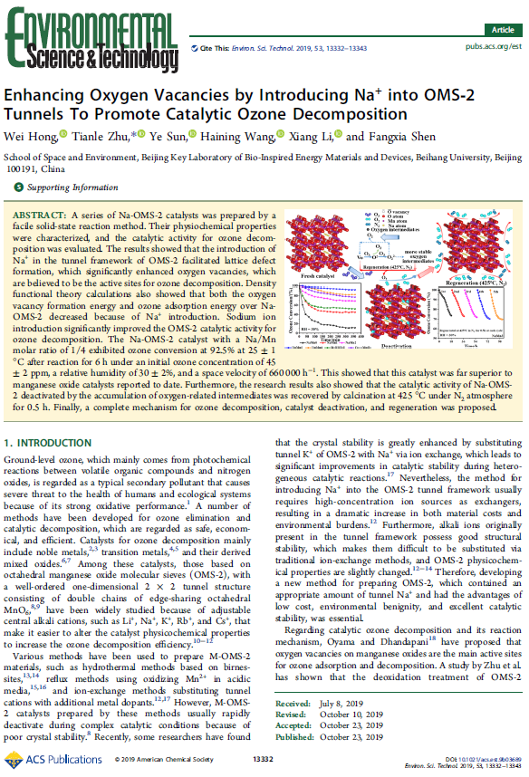 我院朱天乐教授课题组成功制备了用于臭氧降解的Na-OMS-2催化剂,该研究成果 “Enhancing OxygenVacancies by Introducing Na+ into OMS‑2 Tunnels ToPromote Catalytic Ozone Decomposition” 发表在环境领域知名期刊Environmental Science& Technology上,论文的第一作者是我院2017级博士生洪威,北航为唯一通讯单位。