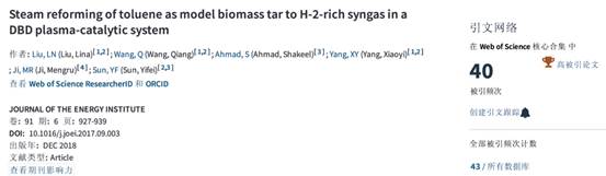 据ESI最新数据显示,我院孙轶斐教授作为通讯作者在《Journal of EnergyInstitute》上发表的题为《Steam Reforming of Toluene as Model BiomassTar to H2-rich Syngas in a DBD Plasma-Catalytic System》的论文,自2019年9月起入选ESI高被引论文,所属学科领域为工程学,北航为唯一通讯单位。