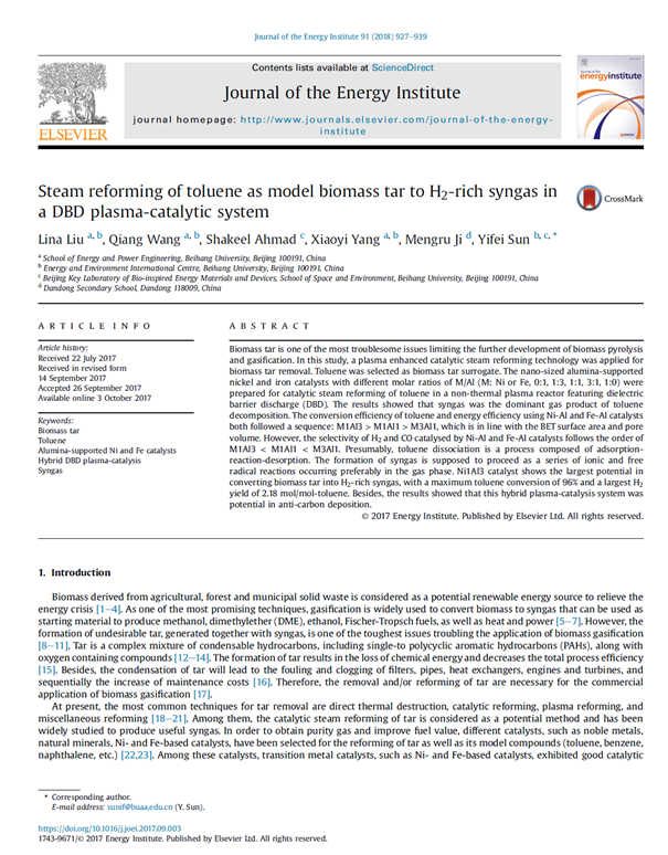近年来,随着全球能源需求总量的增加和化石能源的日益消耗,可再生能源的开发和利用备受关注。生物质能作为一种来源广泛的可再生能源,其能源化利用成为当前研究的热点问题。生物质气化技术能够将可再生生物质能有效转化为可供人类利用的合成气(H2和CO),然而该过程中焦油的产生会造成能源效率的降低以及下游设备的堵塞,是生物质气化技术发展所面临的瓶颈问题。孙轶斐教授课题组利用低温等离子体协同催化技术对生物质焦油模拟物进行水汽重整制备富氢合成气。通过催化剂的理化特性调控,实现焦油的高效、稳定、定向富氢合成气转化;并揭示低温等离子体协同催化焦油重整的反应机理,有效促进生物质气化技术的工业化应用进程。