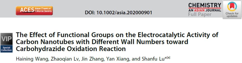 我院卢善富研究员和王海宁副教授课题组针对这一科学问题通过实验研究和理论模拟的方法,以两个模型电催化体系,VO2+/VO2+的电催化氧化还原(全钒液流电池正极电解液)和碳酰肼的电催化氧化(燃料电池液体燃料)探究了不同壁数碳纳米管的电催化活性的差异及相关机制。通过研究发现,不同壁数的碳纳米管存在多种类型的官能团,如羟基、羧基、缺陷位点等;随着壁数的不同,其表面官能团含量存在较大差异,这是造成不同壁数碳纳米管对同一电催化反应活性存在差异的主要原因。对于上述两个模型电催化体系,其电催化活性均主要受到CNT表面羧基含量的影响,羧基含量越高,电催化反应电流密度越高,原因在于碳纳米管表面的羧基官能团有利于碳酰肼分子、钒离子等反应物种在碳纳米管表面吸附;而对于钒电对的氧化还原反应的可逆性主要受碳纳米管表面缺陷含量的影响,缺陷程度越大,可逆性越差。相关研究工作分别发表在国际学术期刊Chem Asian J (2020, 15, 3451,封面及VIP论文)和Phys Chem Chem Phys (2018, 20, 7791)。该系列研究工作有助于研究者加深碳纳米管电催化机制的理解,为高效碳基非贵金属催化剂的设计提供了思路。