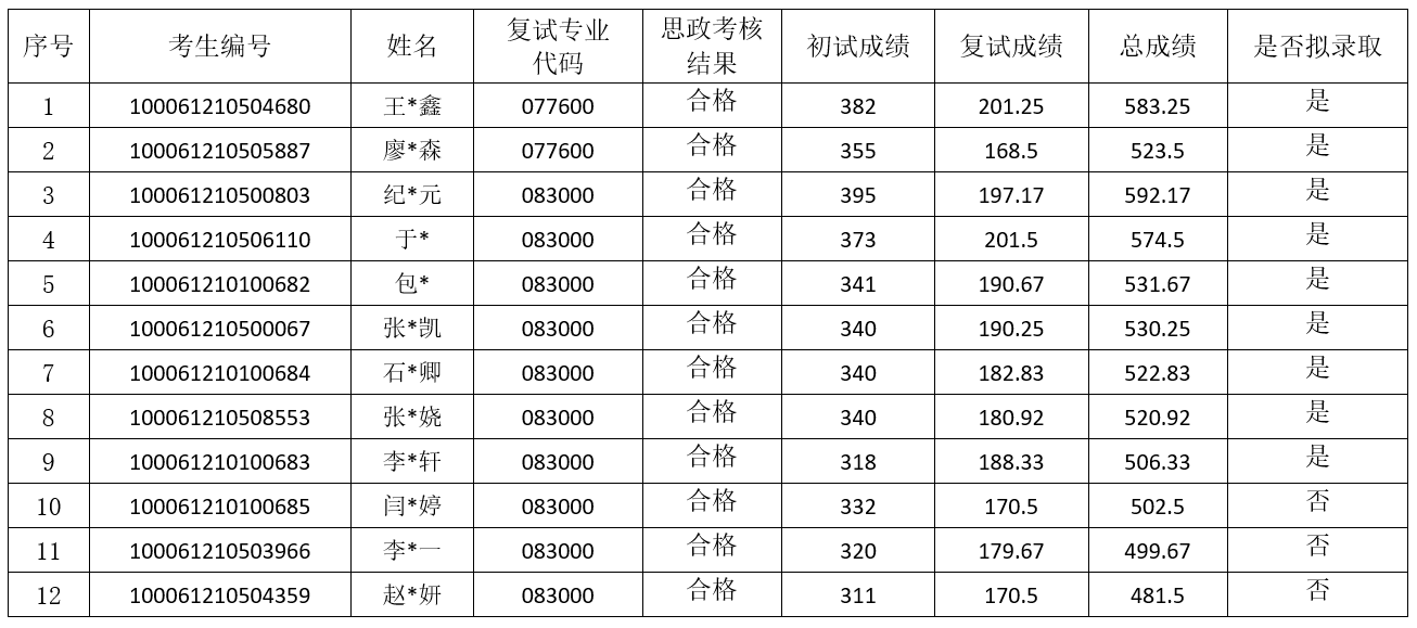 2021年硕士研究生复试结果公示(077600、083000专业)