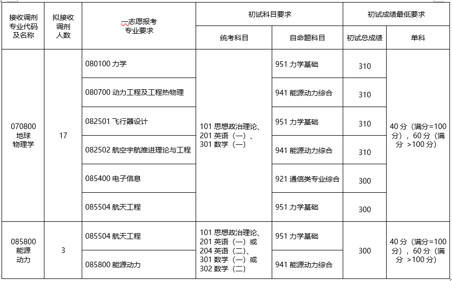 注:1.仅接收全日制学习方式。2.我校总体生源充足,申请调剂考生原则上初试科目应有我校自命题科目,一志愿报考专业、初试分数及初试科目见上表。